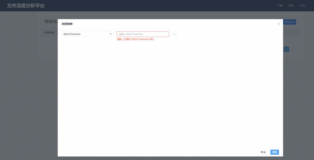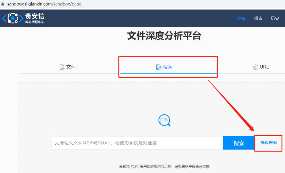 也可以在沙箱首页的高级搜索中选择IP进行关联搜索,点击首页中的搜索选项卡中的高级搜索按钮: