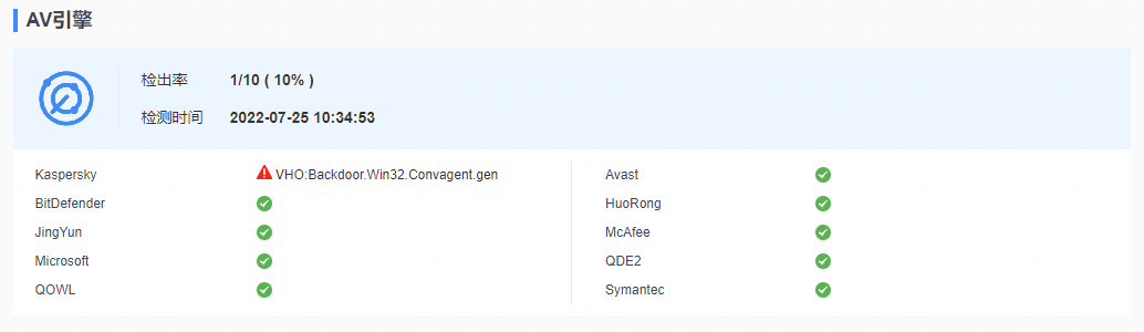 通过点击导航栏的AV引擎检测可以看到样本免杀效果不错,大部分杀软并未报毒。