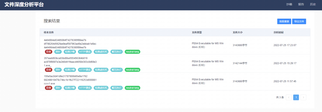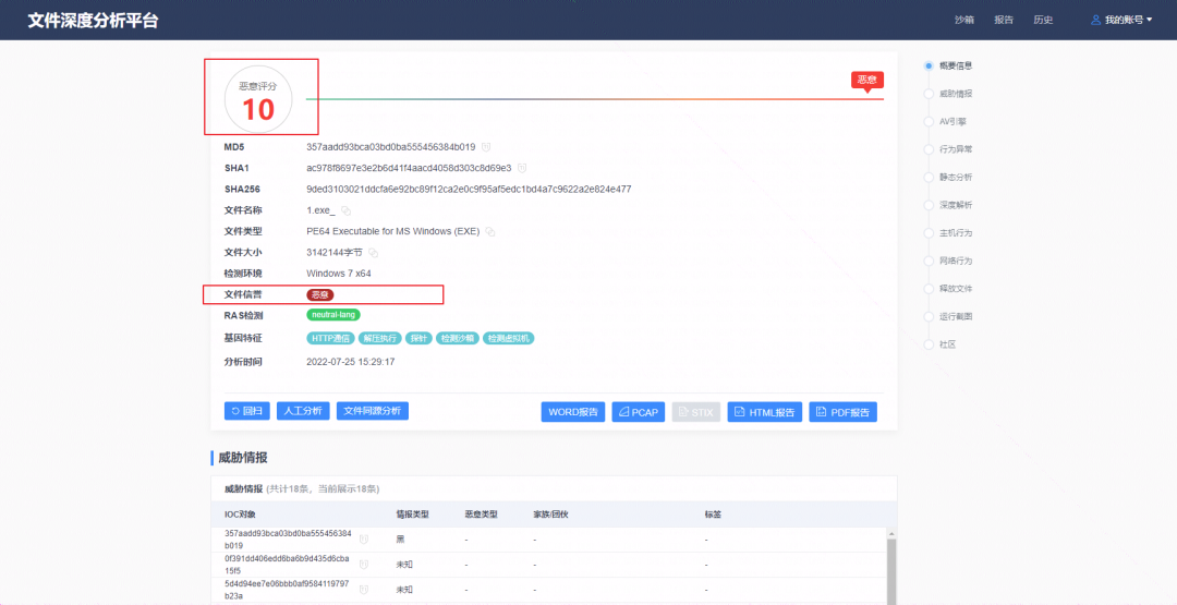 在上传待分析文件后,可以手动设置沙箱分析参数:分析环境(操作系统)、分析时长等。由于红雨滴云沙箱针对各类样本已经进行了智能化判定,所以基本上以默认方式提交检测即可。点击“开始分析”按钮后,会自动跳转到对应样本的分析检测结果页面。稍等数分钟则可以看到整个样本的详细分析报告。