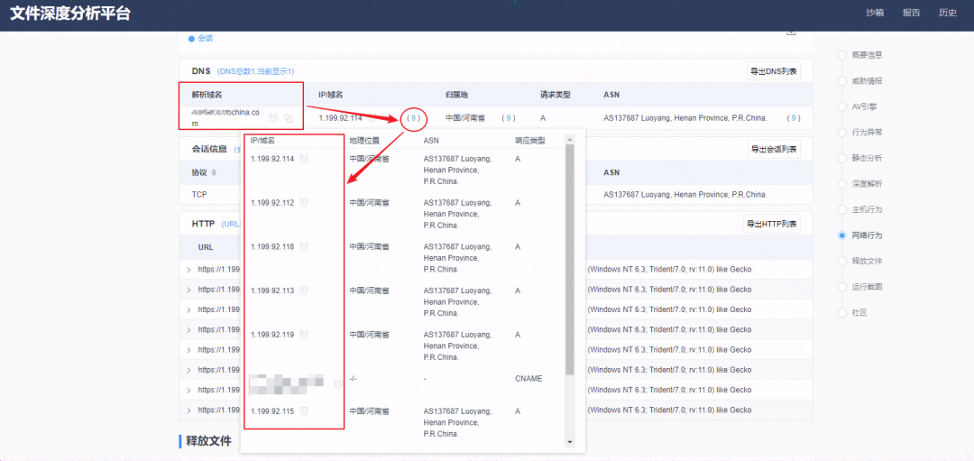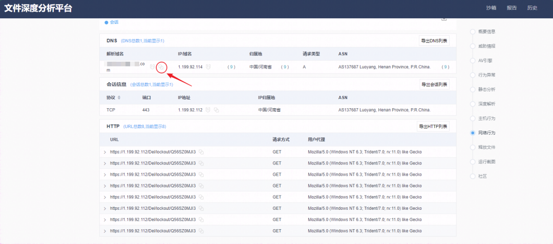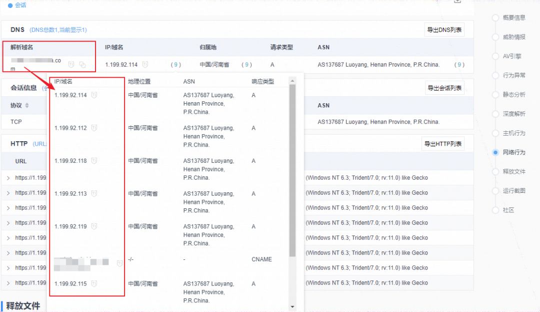 由于该样本使用了CDN隧道通信技术,在这里我们直接通过右侧导航栏点击查看网络行为选项对样本的通信过程进行分析。