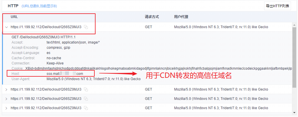 3. 最终,CDN服务商的IP:1.199.92.112接受到了攻击样本发送的HTTPS请求后,通过HOST中指定的加速域名:sso.mail.***china.com(攻击者注册的加速域名,并非真实的DNS域名),将通信数据转发至攻击者真实的C2地址上。从而完成了C2地址的隐藏。