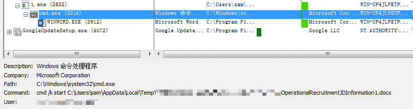 样本使用go作为开发语言,并使用MinGW进行编译,运行后,首先使用TLS进行反调,然后通过判断系统内存、处理器个数、时间差等进行反沙箱操作。随后在%temp%目录下释放诱饵文档,然后通过调用cmd.exe将诱饵文档打开以迷惑受害者。
