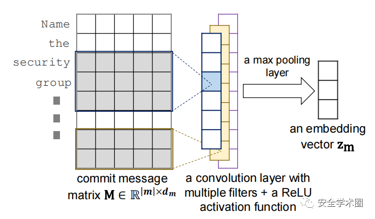 特征提取层的核心是两个分别用于处理Commit向量和代码变更向量的CNN。图2是DeepJIT框架中用于处理Commit的CNN网络结构。给定一个Commit词序列,Commit的矩阵表示M由词的词向量组成,即:。