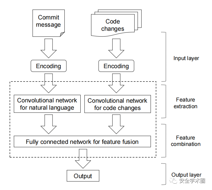 本文作者提出了一种用于JIT缺陷预测的端到端深度学习框架,从Commit消息和代码变更中提取特征,基于所提特征来识别缺陷。作者在QT和OPENSTACK上对框架性能进行了评估,在QT下的AUC有10.36-11.02%的进步,在OPENSTACK下有9.51-13.69%的进步。DeepJIT的框架如图1所示,由(1)输入层,(2)特征提取层,(3)特征联合层和(4)输出层组成。