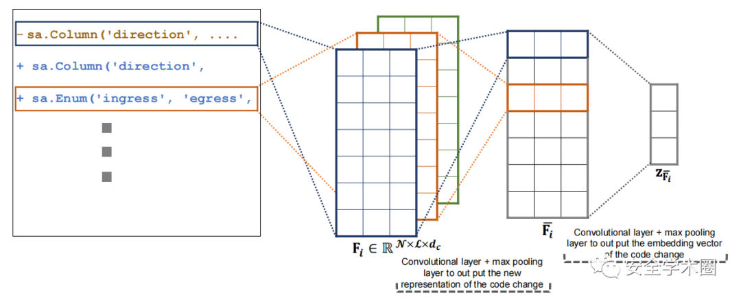 用于处理代码变更的CNN网络结构如图3所示。作者提到,虽然代码变更可以看做是单词序列,但是其与自然语言的区别在于代码是有结构的。代码变更包括(1)不同文件的变更和(2)每个文件中不同种类的变更(添加和删除)。
