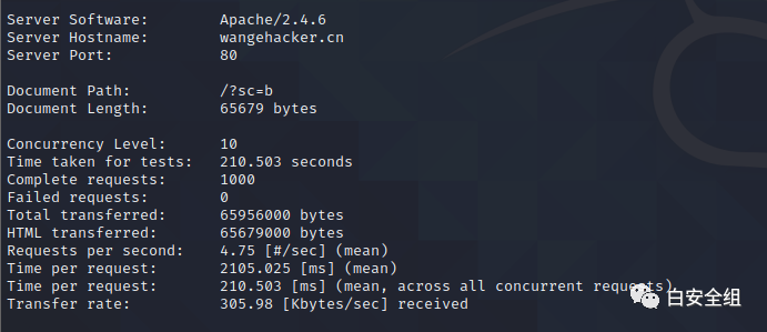 Server Software表示被测试的Web服务器软件名称。Server Hostname表示请求的URL主机名。Server Port表示被测试的Web服务器软件的监听端口。Document Path表示请求的URL中的根绝对路径,通过该文件的后缀名,我们一般可以了解该请求的类型。Document Length表示HTTP响应数据的正文长度。Concurrency Level表示并发用户数,这是我们设置的参数之一。Time taken for tests表示所有这些请求被处理完成所花费的总时间。Complete requests表示总请求数量,这是我们设置的参数之一。Failedrequests表示失败的请求数量,这里的失败是指请求在连接服务器、发送数据等环节发生异常,以及无响应后超时的情况。如果接收到的HTTP响应数据的头信息中含有2XX以外的状态码,则会在测试结果中显示另一个名为“Non-2xxresponses”的统计项,用于统计这部分请求数,这些请求并不算在失败的请求中。Total transferred表示所有请求的响应数据长度总和,包括每个HTTP响应数据的头信息和正文数据的长度。注意这里不包括HTTP请求数据的长度,仅仅为web服务器流向用户PC的应用层数据总长度。HTML transferred表示所有请求的响应数据中正文数据的总和,也就是减去了Total transferred中HTTP响应数据中的头信息的长度。Requests per second吞吐率,也叫QPS,计算公式:Complete requests/Time taken for tests