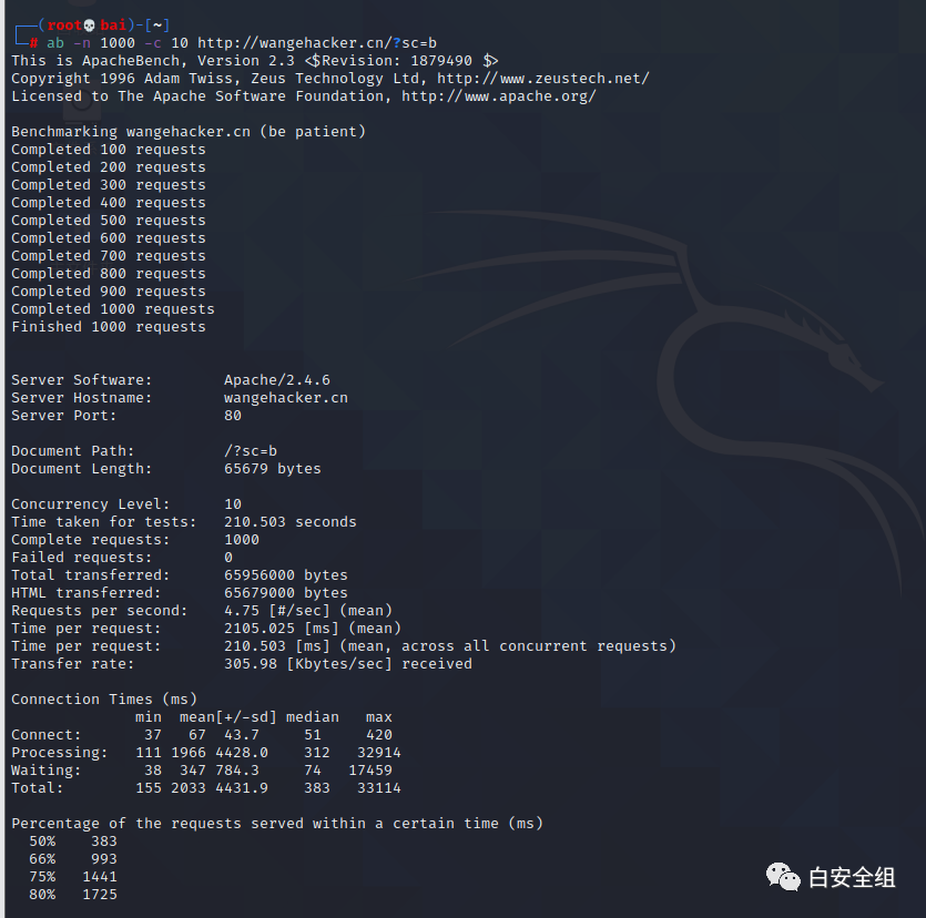 ab -c 1000 -n 200 http://网址/ //这行表示处理1000个请求并每次同时运行200次请求。-n 100表示请求总数为1000-c 10表示并发用户数为200