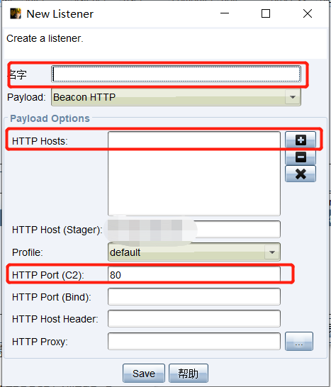 名字随便起;HTTP Hosts右边点"+"号,一般默认就是你云服务器的地址,直接确定就好;HTTP Port(C2)设置一个你云服务器不用的端口,建议10000以上,不容易跟已有端口冲突,一旦冲突服务就起不来了;其他一切选项保持默认。