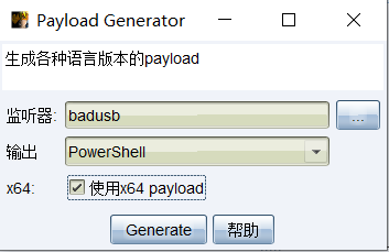 菜单栏 攻击-->生成后门-->Payload Generator