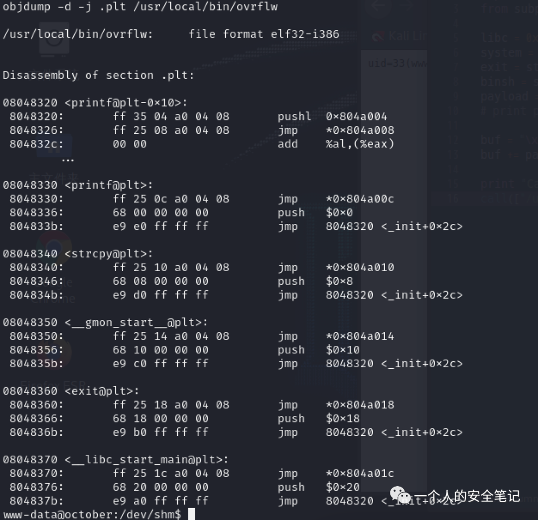 $ objdump -d -j .plt /usr/local/bin/ovrflw先假设 libc.so 的基地址 0xb75f8000,随后进行计算: