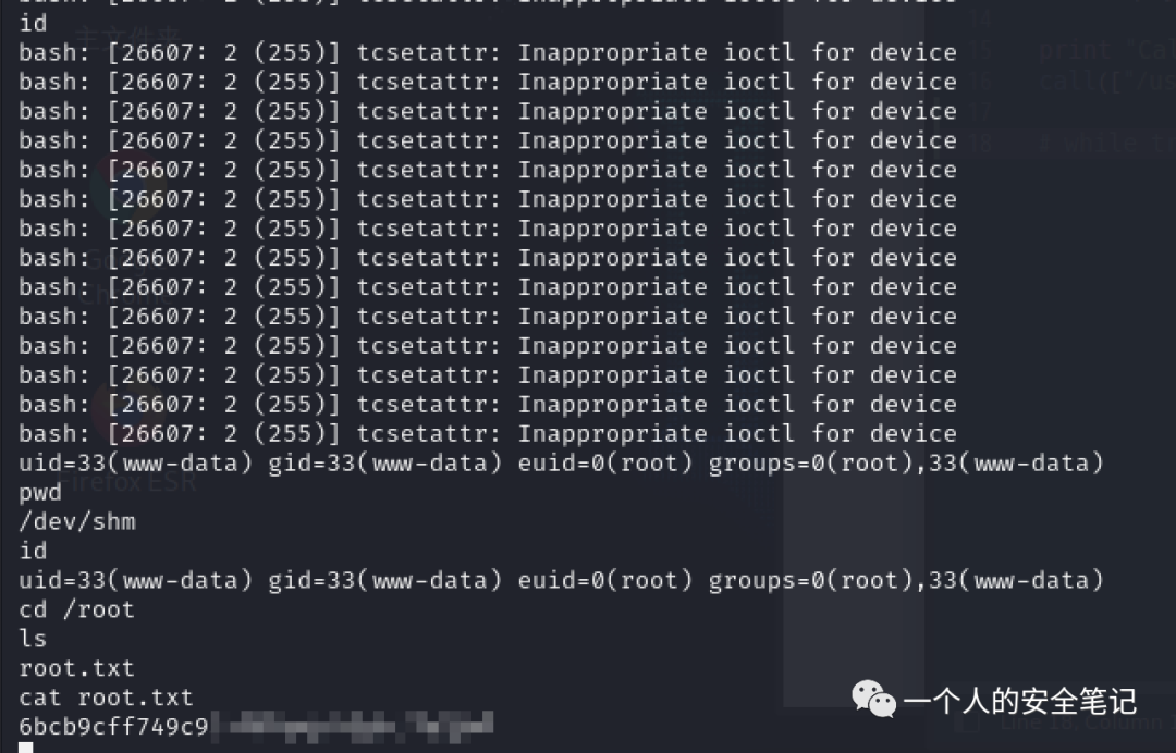 通过 WebShell 进行命令执行反弹一个 NC 会话,会得到 www-data 用户的交互 shell,随后在 /home/harry 目录中找到 User Flag。