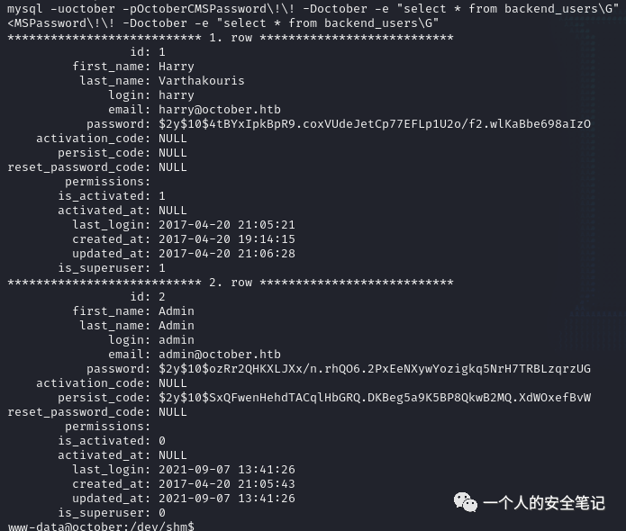 ],通过 mysql -e 参数进行命令行下的 SQL 语句执行,得到 harry 的密码 hash: