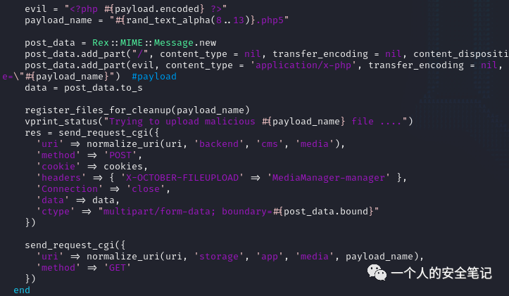 https://bitflipper.eu/finding/2017/04/october-cms-v10412-several-issues.html利用方式直接阅读 `php/remote/47376.rb` 代码脚本就好,脚本存在三个参数都有默认值: