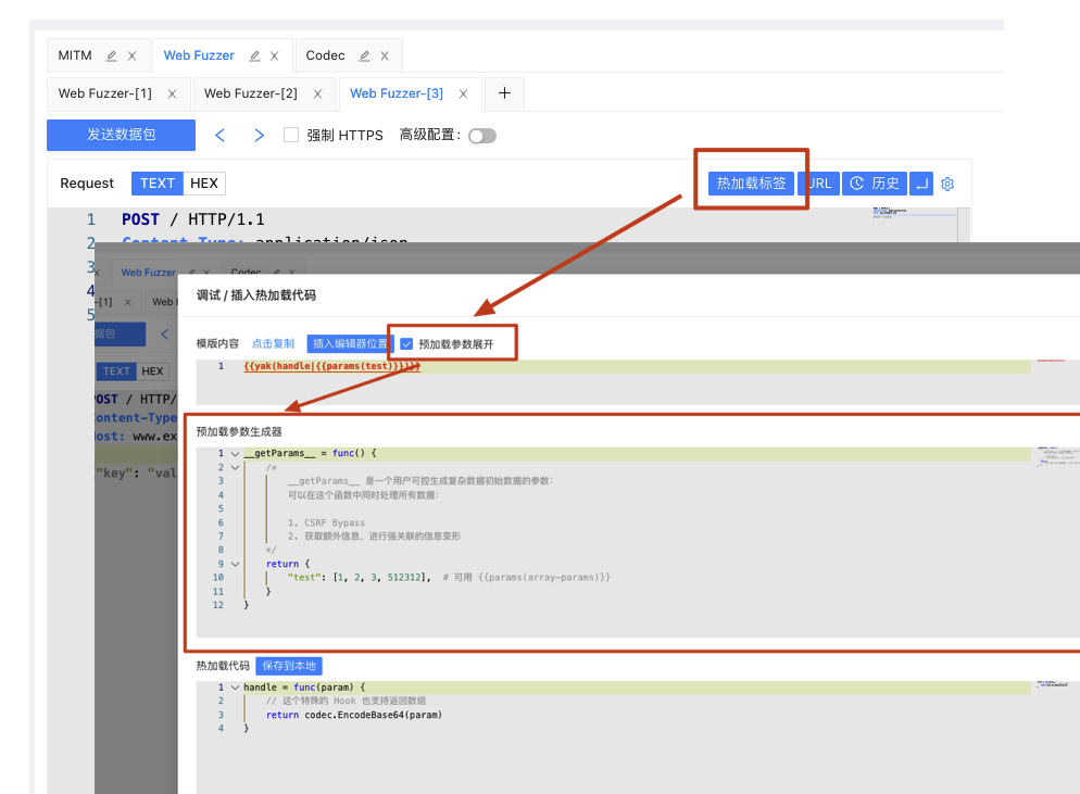 我们通过 Web Fuzzer Request 区域的 “热加载标签” 打开热加载代码调试界面,然后点击 “预加载参数展开” 即可看到 __getParams__ 函数,我们填写这个函数,可以快速生成一个可适配在 {{params(...)}} 标签中的参数列表