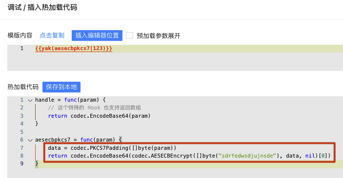 当我们实现了这个加密函数之后,我们可以直接编写一个 Yak 热加载标签,加载 `aesecbpcks7 这个函数,这个函数实现具体内容如下