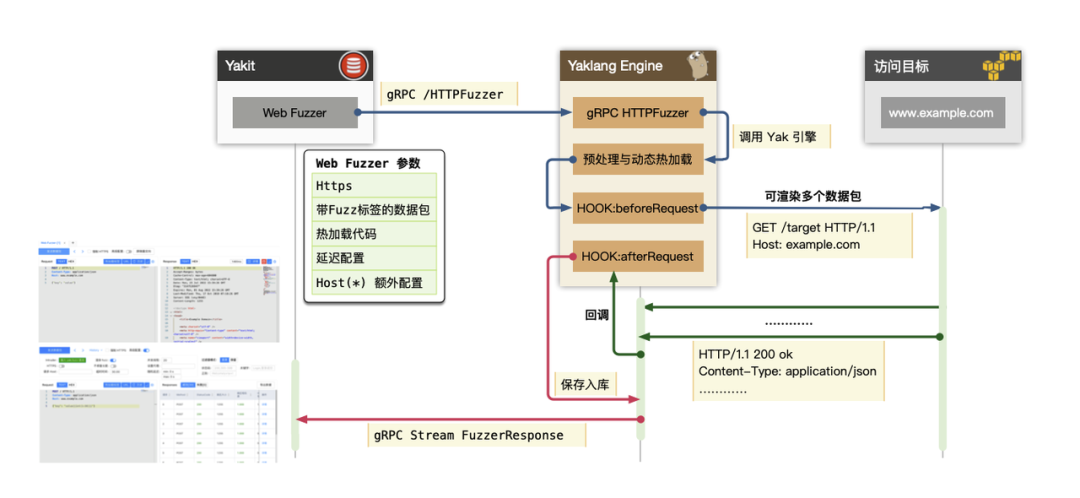 我们实现 Web Fuzzer 的时候,其实并不是简单的把一个数据包发送出去,同时为了保证数据包的自动纠错,自动修复Content-Type,实现自动热加载,我们实现了下面非常复杂的流程