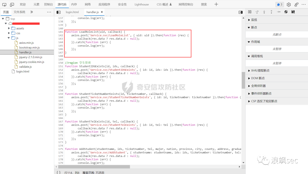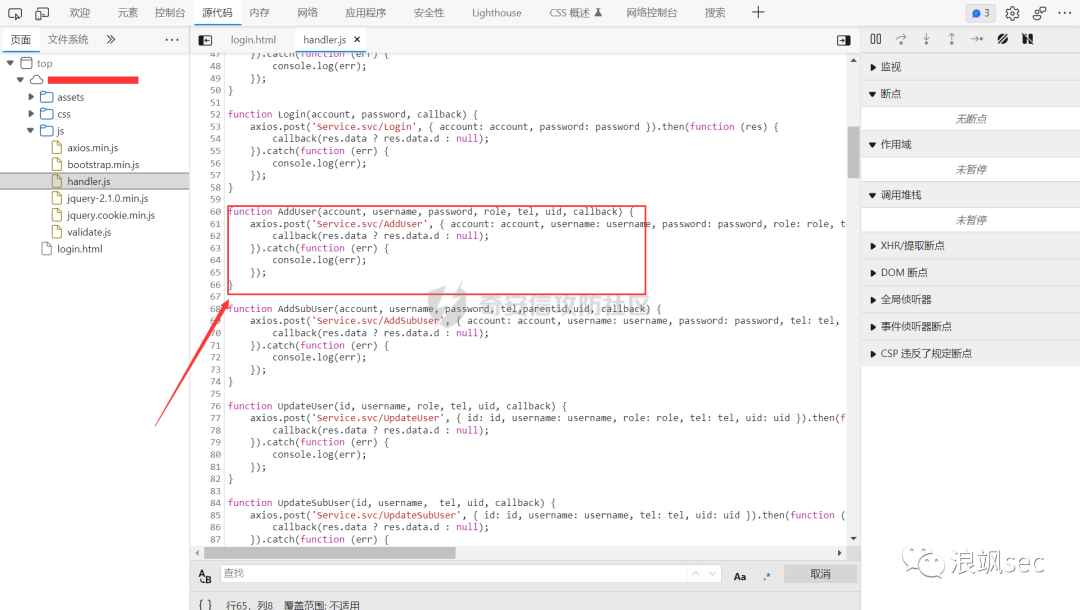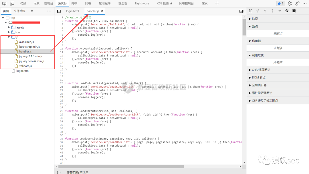 第一条路无果,接着来看JS里有没有什么有用的信息(如未授权的接口等),F12大法来分析一波 翻了几个js文件 发现 handler.js 这里有很多接口 Go Go Go !