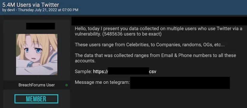 通过利用社交媒体平台中出现的已修复漏洞,攻击者获得并泄露540万Twitter用户数据。泄露数据正在黑客论坛Breached Forums上出售。攻击者可以利用漏洞通过相关的电话号码/电子邮件找到 Twitter帐户,即使用户已选择在隐私选项中阻止这种情况。泄露数据库包含电子邮件、电话号码等信息,并且卖家还以csv文件的形式分享了一份数据样样例。