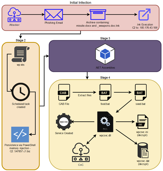 朝鲜背景的APT37组织,通过网络钓鱼邮件发送恶意附件开展攻击活动,Konni恶意软件作为压缩文件附件嵌入到网络钓鱼文档中。Konni恶意软件是一种远程访问木马(RAT),能够在主机上建立持久性并提升权限。APT37曾用该恶意软件于2022年1月攻击俄罗斯外交部部长,但是此次攻击的基础设施与APT28的IP,托管服务器以及主机名之间存在交叉,所以此次攻击活动背后的真正APT组织有待确定。下图是攻击流程图。