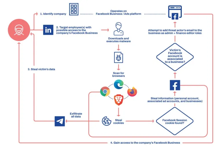 WithSecure(前身为F-Secure)的研究人员披露了一起名为DUCKTAIL的持续攻击活动,该活动针对Facebook的商业和广告平台的运营员工,使用信息窃取恶意软件窃取浏览器cookie并滥用经过身份验证的Facebook会话从受害者的Facebook帐户中窃取信息,最终劫持受害者管理的Facebook 商业帐户。攻击者疑似是来自越南的APT组织,于2018年开始活跃,以攫取经济利益为目的,主要针对美国、印度、沙特阿拉伯、意大利、德国、瑞典、芬兰和菲律宾等国的目标。下图是攻击活动流程示意图。