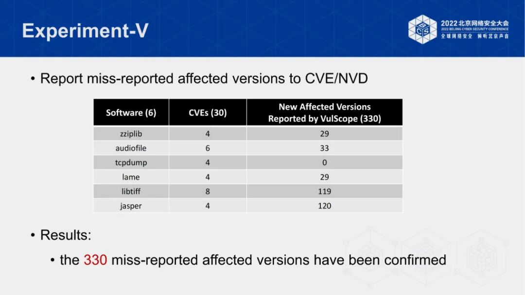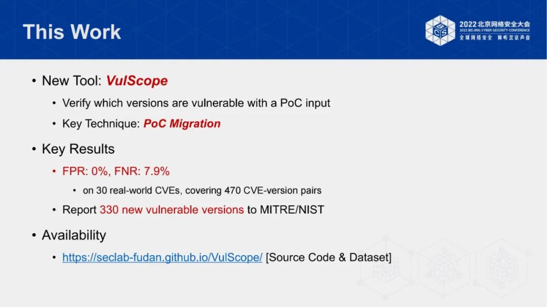 戴博士团队在30个real-world CVE上评估了PoC移植技术的效果。在实验中,戴博士团队通过人工验证,发现该方案在数据集上具有0误报的出色效果。同时,该方案成功检测出330个未被CVE披露的漏洞影响版本。最后,戴博士团队向CVE官方提交了检测出的330个遗漏版本和相关PoC,并已全部被接收,再次印证了该PoC移植工作的有效性和必要性。