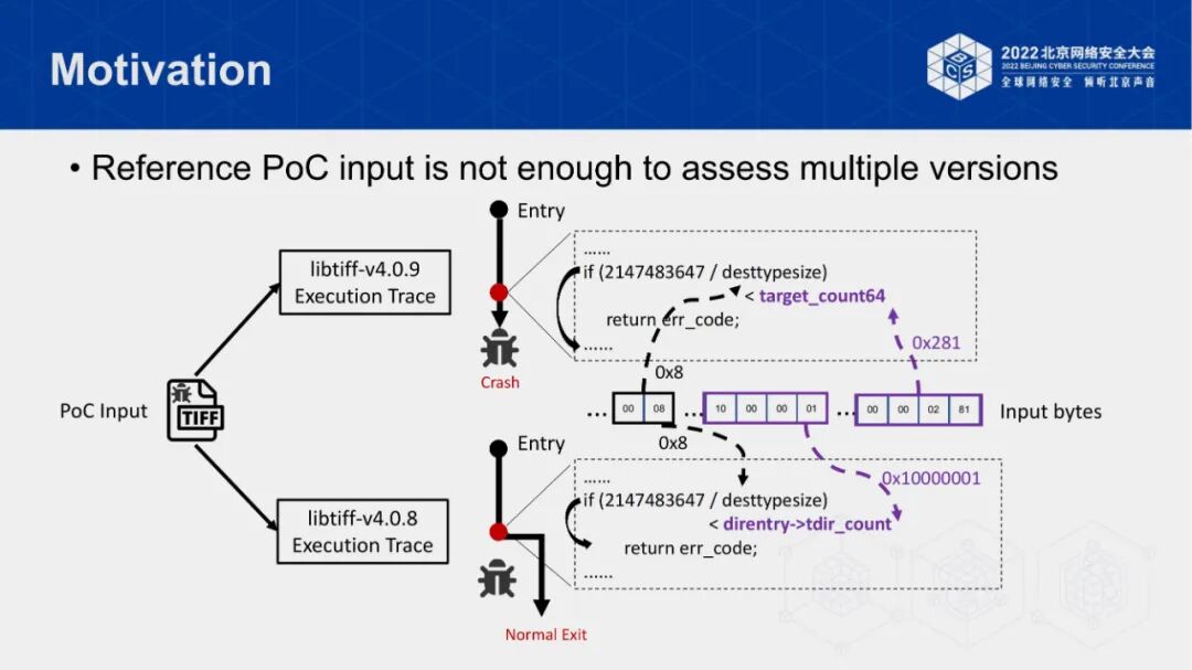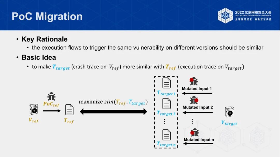 戴博士总结了该方案的核心思想,即在不同版本软件上触发同一个漏洞,其漏洞触发路径是相似的。因此,使PoC在参考版本和目标测试版本上的代码执行路径越来越接近,则有更高的概率触发不同版本上的同一漏洞。