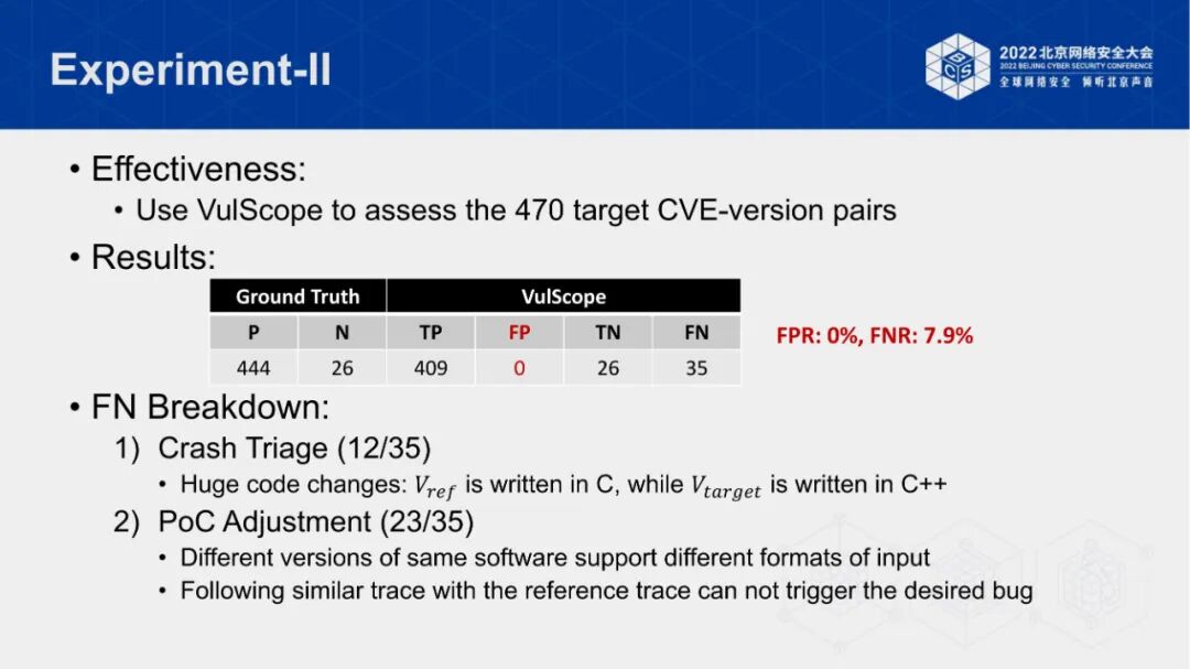 针对这一问题,戴博士团队通过调研现有相关研究,评估了诸如补丁存在性检测,代码克隆检测技术在该问题上的效果。评估结果表明这些静态分析技术存在非常高的误报,而高误报会导致安全应急人员无法精准确认实际受影响的软件版本,须消耗大量人力进行结果的筛查。为了实现精准定位漏洞影响版本范围这一目标,戴博士团队提出了基于PoC移植的漏洞影响范围评估方案。