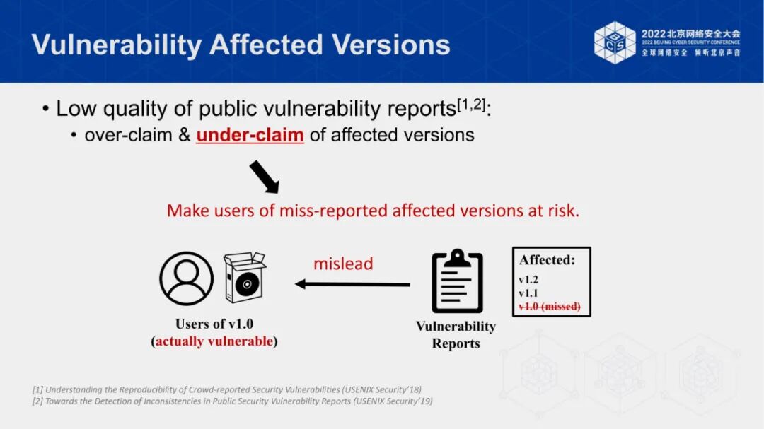 安全运维人员通常依赖于公开的漏洞报告进行供应链安全问题的应急响应与故障修复。然而现有研究表明,公开漏洞报告中披露的漏洞影响范围通常存在漏报和误报现象。其中,广泛存在的漏报现象会导致大量软件在已知漏洞影响范围内而不自知,极大降低了软件产品的安全性。因此,准确地检测漏洞实际影响的版本范围至关重要。