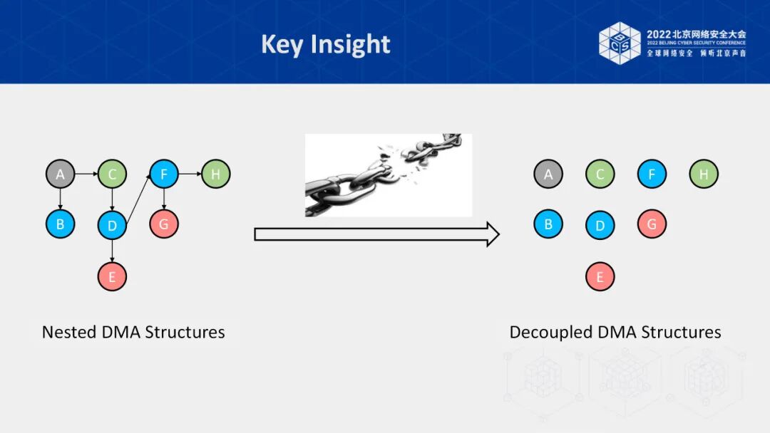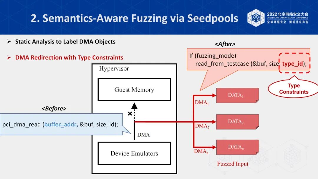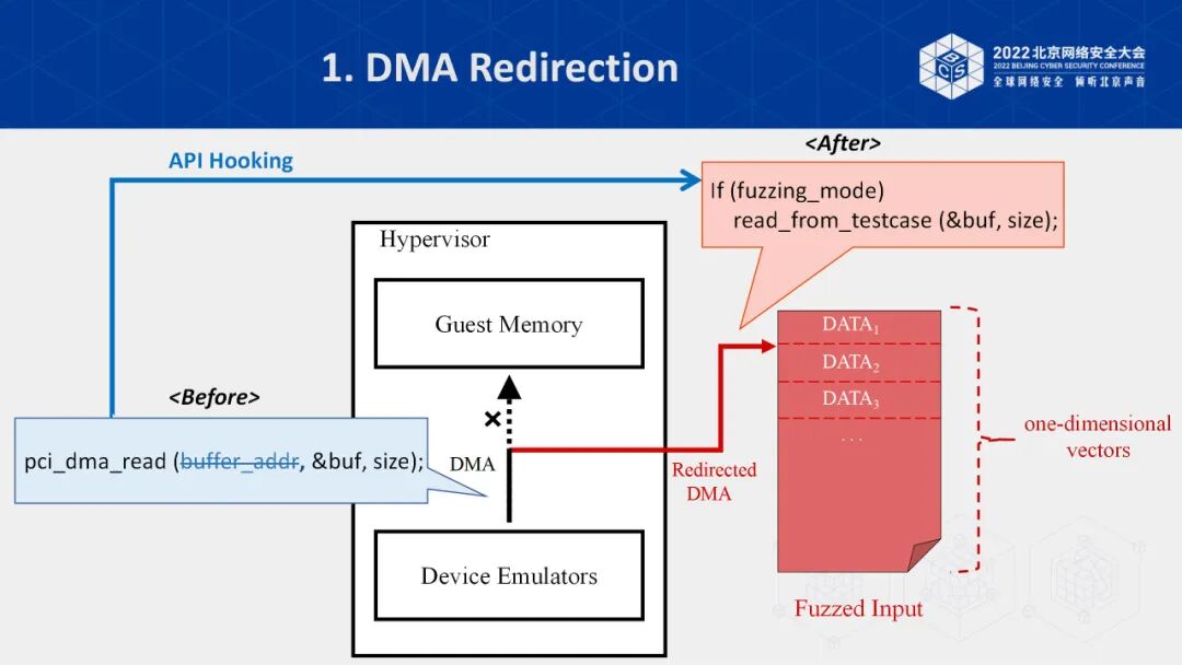 随后潘博士使用DMA重定向的方法,利用api hook技术,把从客户机空间将数据结构读取到进程的步骤替换为从测试用例中直接读取,通过这样的方式,可以消除地址寻址的步骤和复杂指针带来的干扰。