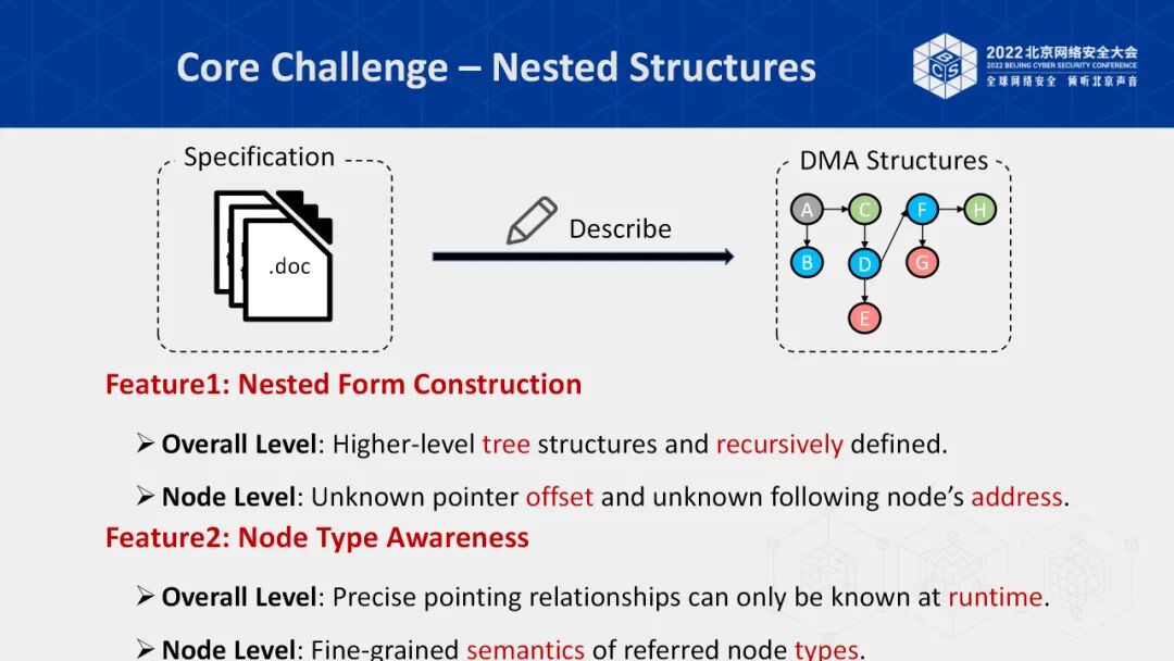 潘博士介绍说,虚拟机模拟设备的模糊测试有别于其他的模糊测试任务,虚拟机模拟设备的数据结构更加复杂,它通常使用递归的方式形成树状的结构,每个节点之间使用指针的方式来表示具体序列。这就带来了两个问题,首先,每个指针的偏移量和子节点的地址都是未知的;同时,不同节点的类型也有区别。综上,这些问题导致对虚拟设备的传统模糊测试方法难以奏效。