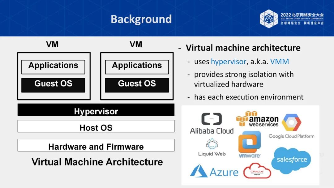 随着云计算的逐渐成熟,越来越多的用户将资产部署在云环境中。潘高宁博士首先介绍了在当前的主流云架构中,hypervisor作为底层的一个基础架构,它的一个重要作用就是给每一个客户机提供了非常强有力的隔离。但与此同时,这种虚拟化操作也可能会带来逻辑上的漏洞,引入新的安全风险。