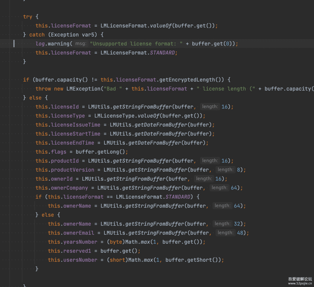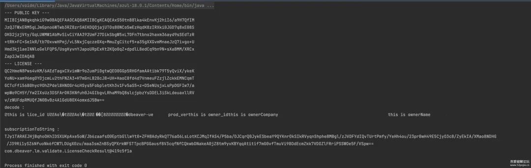 接着往下看, 拿到publicKey 后,开始解密, ras 解密, 没什么好说的, 关键是解密后的 license 格式: