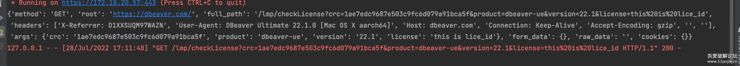 }127.0.0.1 - - [28/Jul/2022 17:11:48] "GET /lmp/checkLicense?crc=1ae7edc9687e503c9fc6d079a91bca5f&product=dbeaver-ue&version=22.1&license=this%20is%20lice_id HTTP/1.1" 200 -