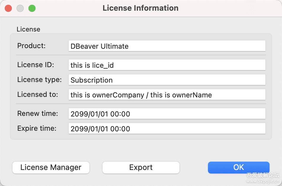buffer.put((byte) 0);// licenseIdfillString("this is lice_id", 16, buffer);// licenseType ULTIMATE('U', "Ultimate license"),buffer.put((byte) 85); // 'U' = 85// licenseIssueTimebuffer.putLong(SIMPLE_DATE_FORMAT.parse("2020-01-01").getTime());// licenseStartTimebuffer.putLong(SIMPLE_DATE_FORMAT.parse("2020-01-01").getTime());// licenseEndTimebuffer.putLong(SIMPLE_DATE_FORMAT.parse("2099-01-01").getTime());// flagsbuffer.putLong(250L);// proeudcIdfillString("dbeaver-ue", 16, buffer);// productVersionfillString("prod_version", 8, buffer);// ownerIdfillString("this is owner_id", 16, buffer);// ownerCompanyfillString("this is ownerCompany", 64, buffer);// ownerNamefillString("this is ownerName", 64, buffer);// license 私钥加密encodeToString = Base64.getEncoder().encodeToString(LMEncryption.encrypt(buffer.array(), privateKey));// 将 publicKey/privateKey/license 保存到文件System.out.println("--- PUBLIC KEY ---");