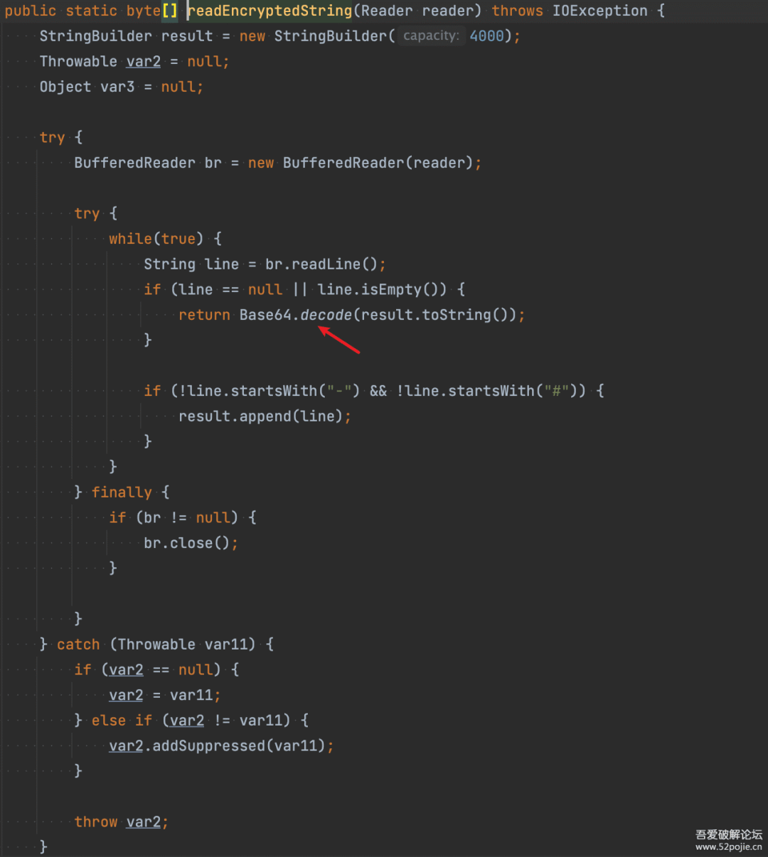 可以看到, 程序先将我们输入到 icense去除空格以及删除‘-’,‘#’这些特殊标记符号之后 base64 解密成字节数组