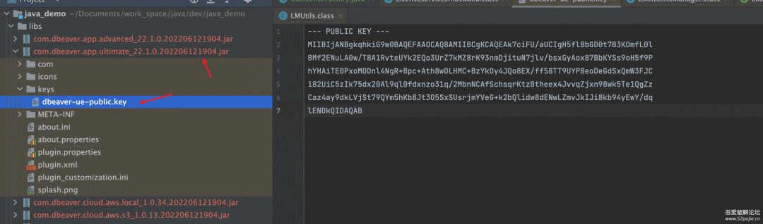 }// 替换原程序中的公钥JarFileReplaceUtil.replaceFile(srcPath + "/com.dbeaver.app.ultimate_22.1.0.202206121904.jar", outPath + "dbeaver-ue-public.key", "keys/dbeaver-ue-public.key");