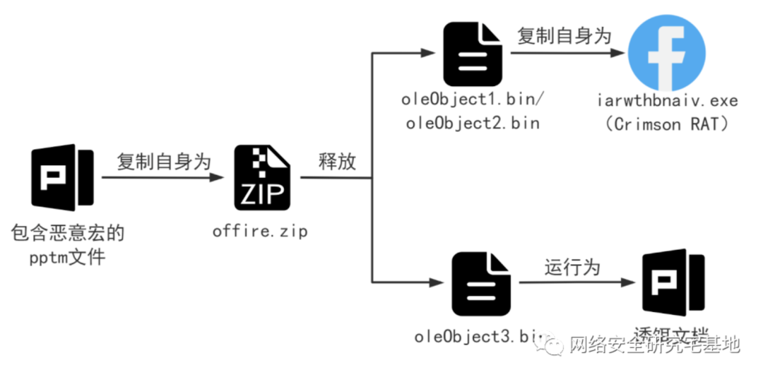 近期研究人员捕获到透明部落组织针对印度国防部下属企业攻击的样本,样本格式为带有恶意宏的pptm文件,可能通过钓鱼邮件投递至印度国防部下属企业,样本中的宏代码会释放并执行CrimsonRAT,执行来自恶意C2的各种命令。