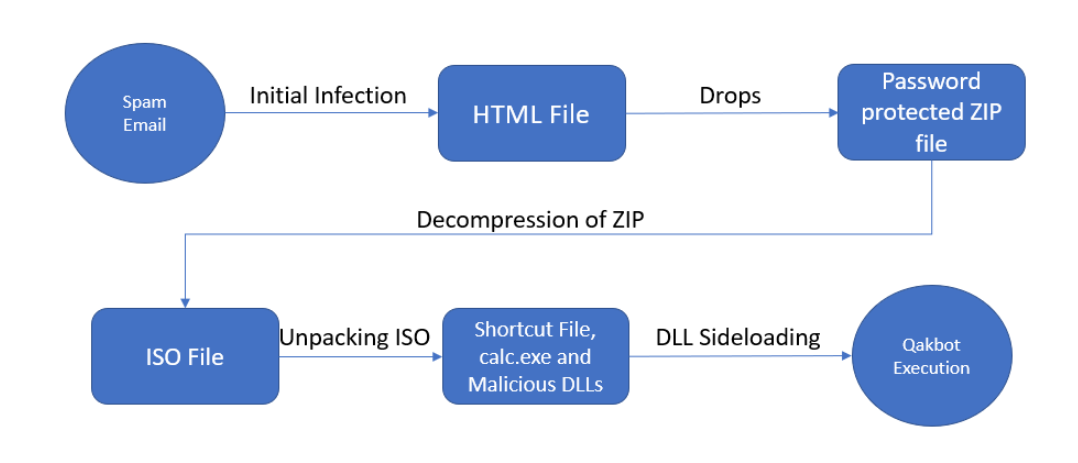 至少从7月11日起,Qbot(又名Qakbot)恶意软件运营商就一直在滥用Windows 7计算器应用程序进行DLL侧加载攻击。Qakbot的初始感染始于包含各种主题的恶意垃圾邮件活动,垃圾邮件包含一个HTML文件,该文件具有base64编码图像和一个受密码保护的ZIP文件,其中包含一个ISO文件。ISO包含一个.LNK文件、一个“calc.exe”副本和两个DLL文件,即WindowsCodecs.dll和一个名为7533.dll的有效负载。