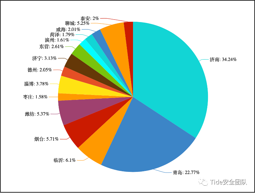 截止2022年07月底,通过潮启移动端安全管控平台共监测到山东省移动应用数量为11091款(不含历史版本)同比06月份新增8款,通过对移动应用地域分布数据追踪发现,目前山东省移动应用数量排名第一位的是济南,共计3636款,较06月份新增4款,占山东省应用总数的34.24;青岛市共计2418款,占比22.77%;临沂共计648款,较06月份新增3款,占比6.1%;烟台共计606款,较06月份新增1款,占比5.71%;潍坊共计570款,占比5.37%;聊城共计558款,占比5.25%。