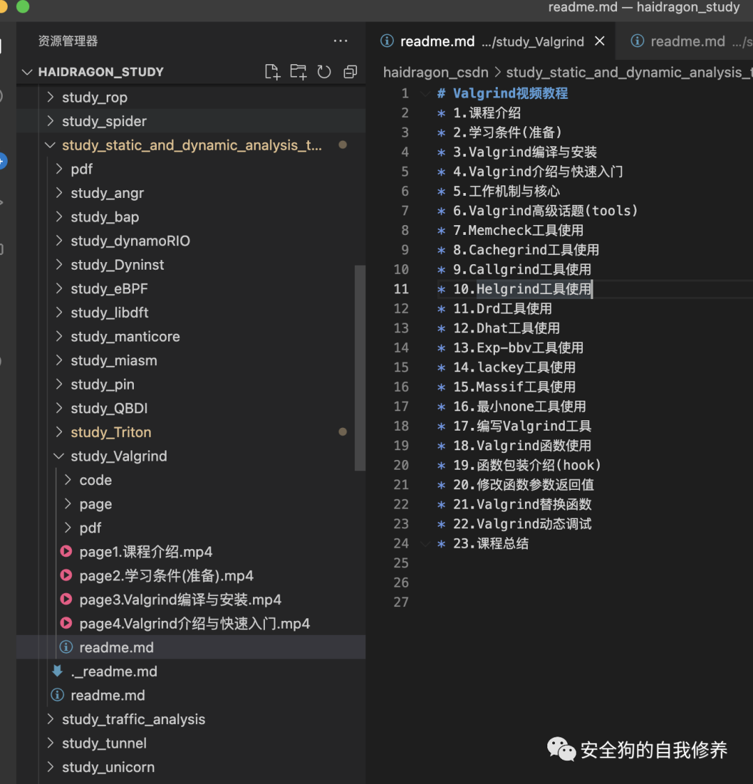 # Valgrind视频教程* 1.课程介绍* 2.学习条件(准备)* 3.Valgrind编译与安装* 4.Valgrind介绍与快速入门* 5.工作机制与核心* 6.Valgrind高级话题(tools)* 7.Memcheck工具使用* 8.Cachegrind工具使用* 9.Callgrind工具使用* 10.Helgrind工具使用* 11.Drd工具使用* 12.Dhat工具使用* 13.Exp-bbv工具使用* 14.lackey工具使用* 15.Massif工具使用* 16.最小none工具使用* 17.编写Valgrind工具* 18.Valgrind函数使用* 19.函数包装介绍(hook)* 20.修改函数参数返回值* 21.Valgrind替换函数* 22.Valgrind动态调试* 23.课程总结