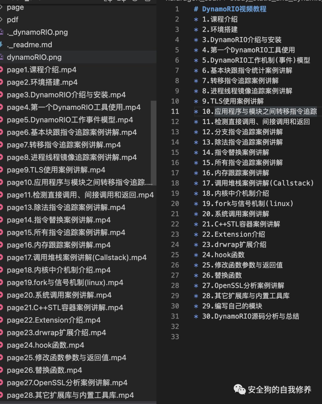# DynamoRIO视频教程* 1.课程介绍* 2.环境搭建* 3.DynamoRIO介绍与安装* 4.第一个DynamoRIO工具使用* 5.DynamoRIO工作机制(事件)模型* 6.基本块跟指令统计案例讲解* 7.转移指令追踪案例讲解* 8.进程线程镜像追踪案例讲解* 9.TLS使用案例讲解* 10.应用程序与模块之间转移指令追踪* 11.检测直接调用、间接调用和返回* 12.分支指令追踪案例讲解* 13.除法指令追踪案例讲解* 14.指令替换案例讲解* 15.所有指令追踪案例讲解* 16.内存跟踪案例讲解* 17.调用堆栈案例讲解(Callstack)* 18.内核中介机制介绍* 19.fork与信号机制(linux)* 20.系统调用案例讲解* 21.C++STL容器案例讲解* 22.Extension介绍* 23.drwrap扩展介绍* 24.hook函数* 25.修改函数参数与返回值* 26.替换函数* 27.OpenSSL分析案例讲解* 28.其它扩展库与内置工具库* 29.编写自己的模块* 30.DynamoRIO源码分析与总结