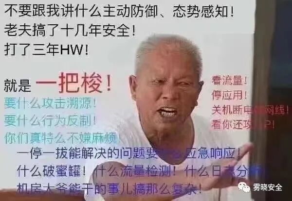 蓝方人员:态势感知/流量分析/入侵检测/各类防火墙的附属品,处理不完的假警报,战斗力被自己天梯战力完爆,永远睡眼惺忪,基本上不在乎红方的存在,只想着换班后该吃啥。