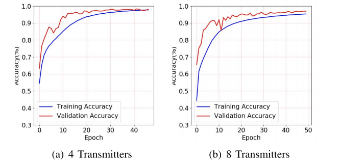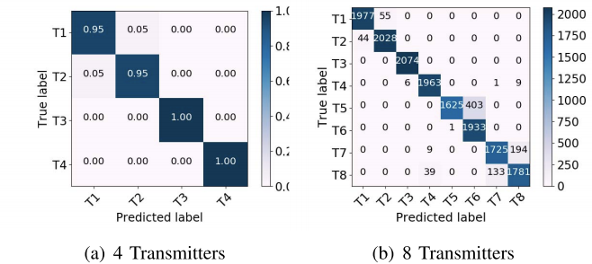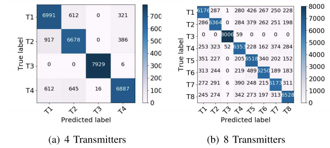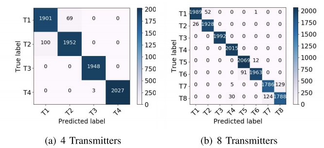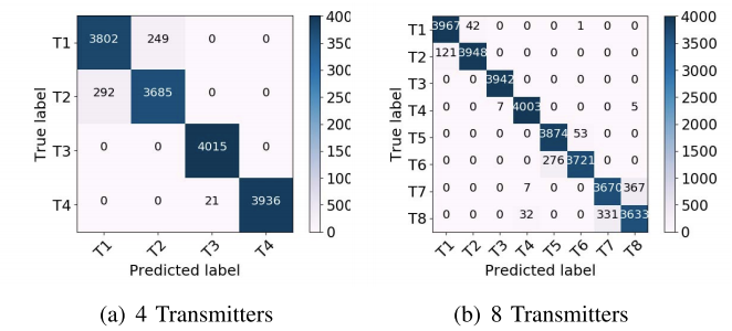 对于RNN,本文首先实现LSTM单元,分别对4个和8个发射机实现了97.40%和95.78%的测试准确度。准确度和混淆矩阵在图13和图14中给出。