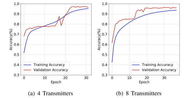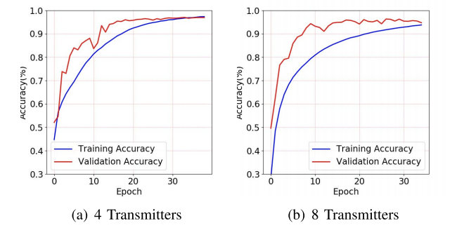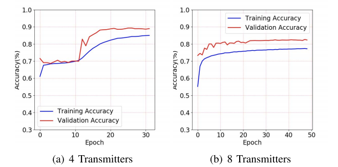 在训练阶段,超参数根据分类交叉熵损失进行调整。有时,通过这种调整,模型往往会过度拟合训练数据。为了避免这种情况,在模型中使用了Dropout正则化。另一种监控并可能避免过度拟合的方法是在训练阶段使用交叉验证。这样确保提议的模型得到公平的训练,以便在测试阶段很好地概括。请注意,验证曲线的波动表明,对于具有一组特定超参数值的某些时期,模型往往会过度拟合数据,但在以后的时期中,超参数值会得到调整以抵消过拟合。此外,可以使用验证阶段的结果调整训练。请注意,由于I/Q样本表示时间序列数据,因此使用RNN对其进行建模是很自然的。由于RNN学习时间序列数据之间的时间相关性,因此它们可以对I/Q数据中的发射机特定变化进行编码,并且直观地使RNN在可信发射机分类任务上比CNN更好。
