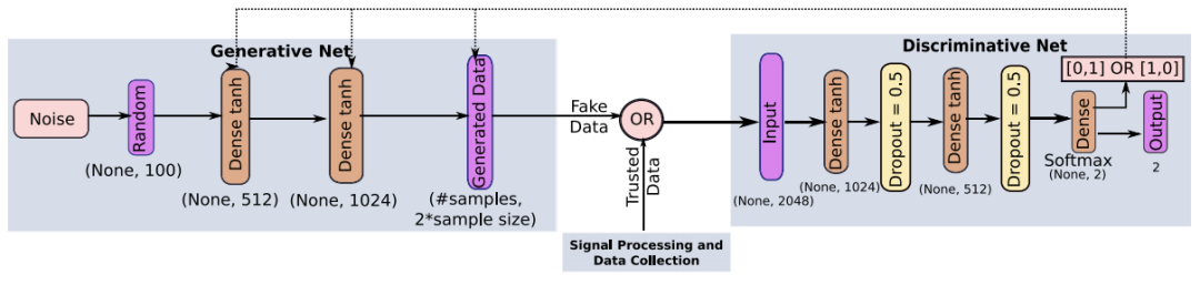 D由一个包含2048个节点的输入层、两个分别包含1024个和512个节点的隐藏层以及最后一个包含2个节点的softmax输出层组成,用于将输入分类为伪造的或可信的。本文在隐藏层使用tanh作为激活函数,并在这些层之间添加了0.5的Dropout以进行正则化。通过迭代顺序学习训练生成器和鉴别器,以随着时间的推移加强生成模型。