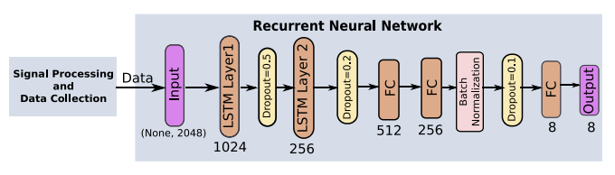 本文设计并实现了一个带有LSTM的RNN,其结构如图7所示。使用2个LSTM层,依次具有1024和256个单元。接下来分别添加2个具有512和256个节点的全连接层。本文对输出使用批量归一化,并将其通过8个节点的密集层。使用ReLU作为LSTM层的激活函数,使用tanh作为密集层的激活函数。最后,使用基于随机梯度下降(SGD)(学习率为10^(-3))的优化和分类交叉熵训练。