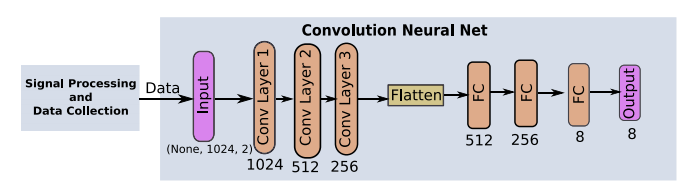 为了捕捉I/Q值之间的相关性,首先实现了一个卷积神经网络(CNN)。本文使用三个分别具有1024、512和256个滤波器的conv2D层、一个Flatten操作和三个大小分别为512、256和8个节点的完全连接(FC)层来实现CNN,如图4所示。本文使用在每个conv2D和密集层之后的Dropout分别为0.25和0.5。本文还在每个Conv2D层使用内核大小(2,3)和步幅(2,2)。本文在每个conv2D层之后应用一个池化层MaxPooling2D,池大小为(2,2),步幅为(2,2)。本文对所有卷积层和全连接层使用ReLU激活,最后一个使用softmax。最后一层中的节点数根据数据集具有的类数而变化。本文使用基于Adam(学习率为10^(-3))的优化和分类交叉熵训练。